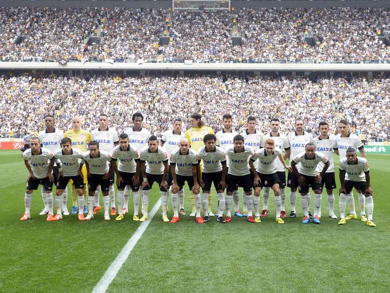 Time do Corinthians posado em novo estádio para o início de uma nova era, mesmo que com derrota