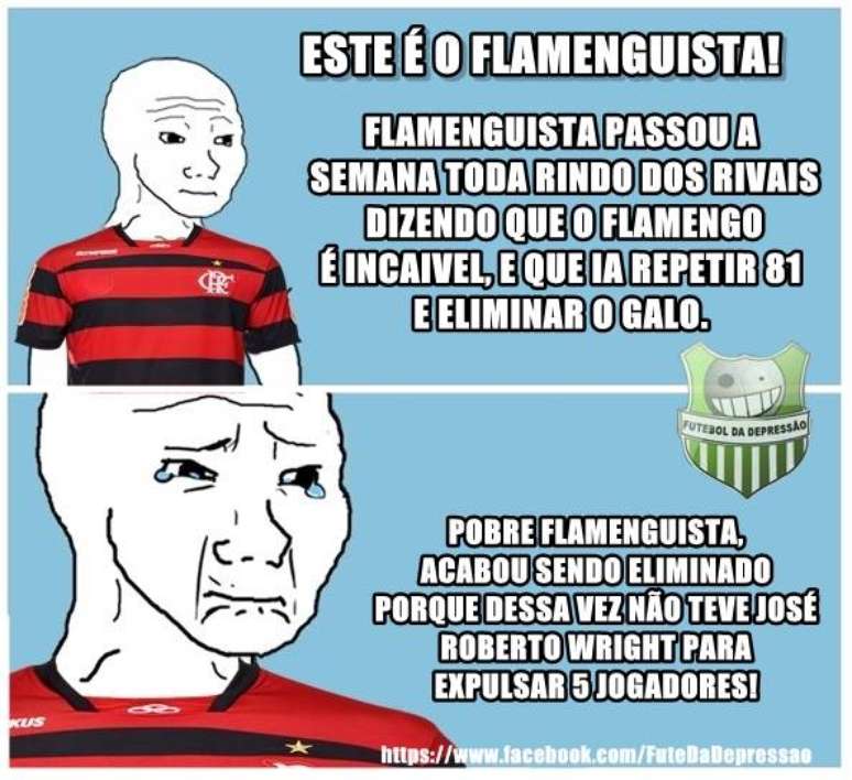 A noite histórica de quarta-feira não poderia passar ilesa da “zoeira” que é a internet. Após as eliminações de Flamengo e Santos, os internautas mostraram toda a sua criatividade e criaram memes para ironizar as equipes carioca e paulista. E teve de tudo, viu? Flamenguista com medo de sair de baixo da cama, chororô que ajudaria na escassez de água em São Paulo, lembrança de um árbitro que teve atuação controversa há 33 anos e até mesmo uma grande tristeza no asilo. Confira, abaixo, os melhores memes:
