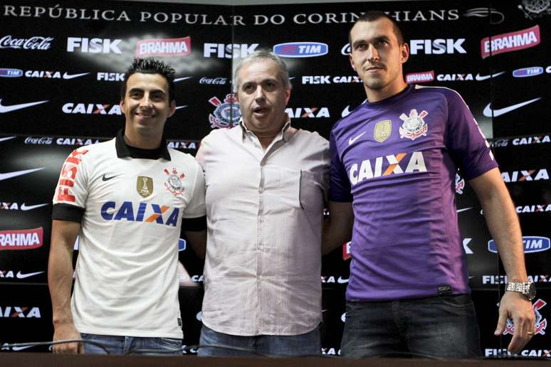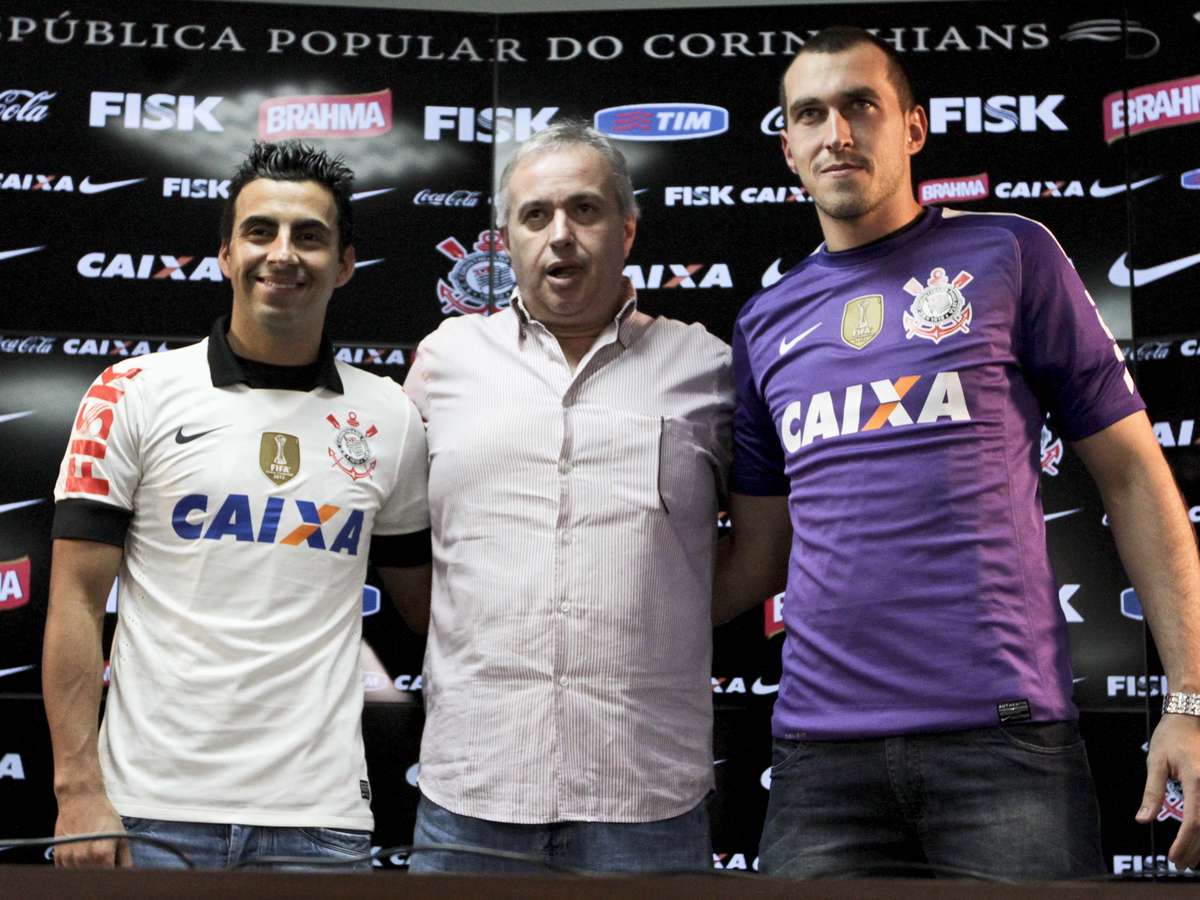Na presença do diretor de futebol do Corinthians, Roberto de Andrade, foram apresentados nesta terça-feira dois reforços: Maldonado (à esq.) e Walter