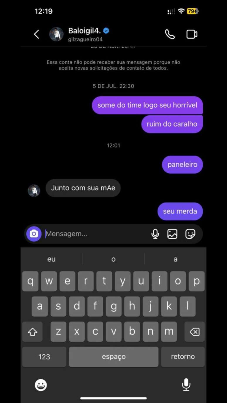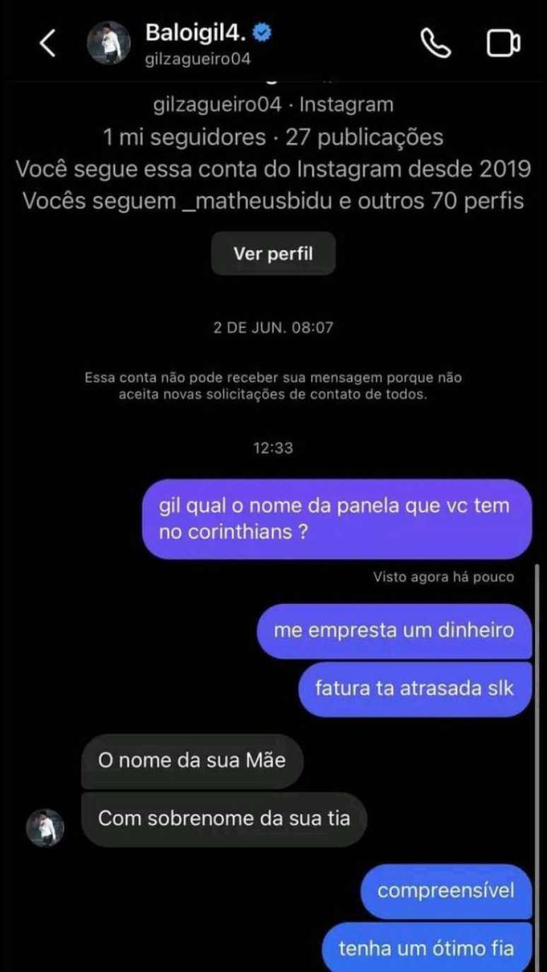 Sobre o zagueiro Gil, o print que apareceu nas redes sociais foi de que o zagueiro estaria respondendo diversas mensagens em seu chat no Instagram. Em uma de suas respostas, o camisa 4 disse: "Guerraaaaaa mesmo." Isso posto, ao ser acusado por torcedores de supostamente estar fazendo parte de uma "panela" no elenco, o camisa 4 rasgou o verbo e respondeu da seguinte forma; Confira os prints: