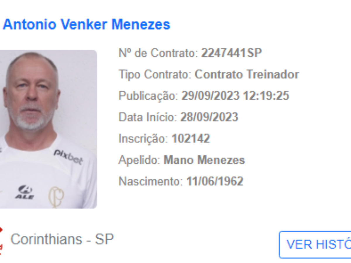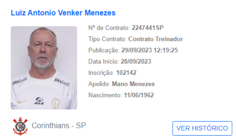 Anunciado na quinta-feira, Mano Menezes foi registrado no BID da CBF e já pode comandar o Corinthians (Imagem: Reprodução)