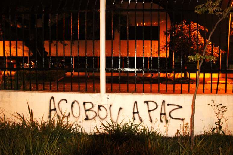 O muro do Parque São Jorge, sede do Corinthians, foi pichado após a eliminação da equipe alvinegra para o Grêmio, na noite da última quarta-feira, pelas quartas de final da Copa do Brasil, em Porto Alegre. A mensagem trazia os dizeres "acabou a paz", com um erro de ortografia.