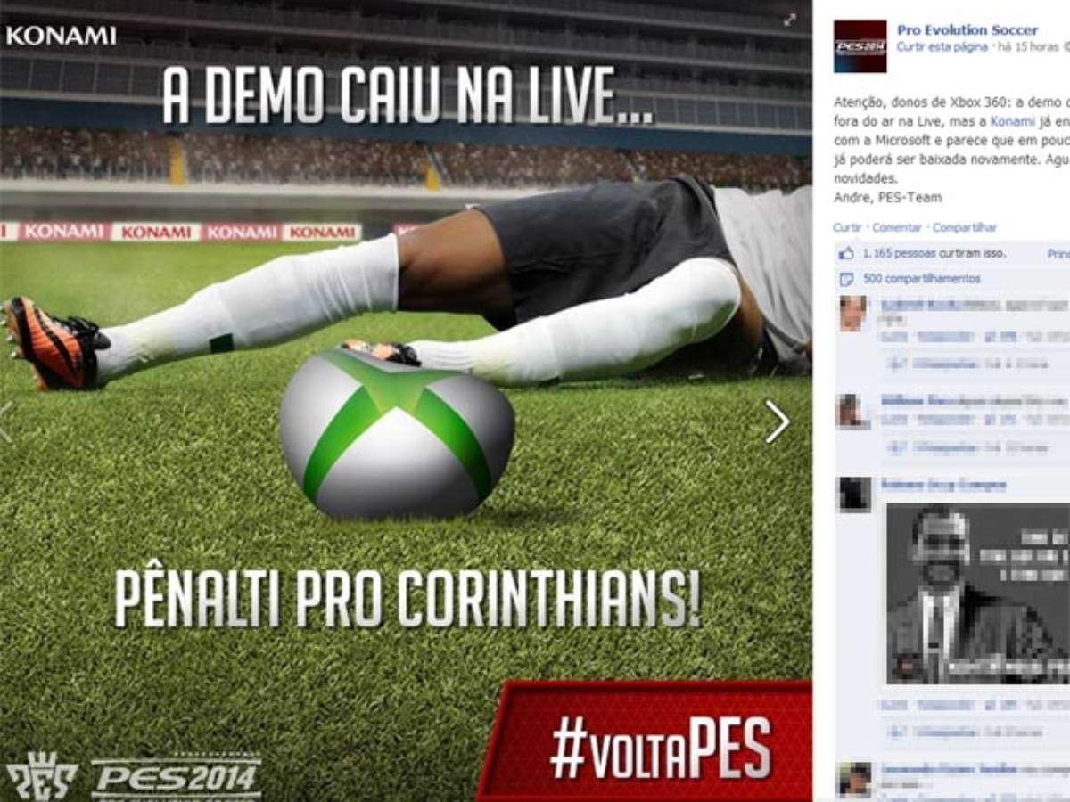 "Atenção, donos de Xbox 360: a demo do PES 2014 está fora do ar na Live, mas a Konami já entrou em contato com a Microsoft e parece que em poucas horas a demo já poderá ser baixada novamente. Aguardem para mais novidades", foi a publicação da página, acompanhada da brincadeira: um jogador caído no gramado e a frase "A demo caiu na Live... pênalti pro Corinthians!".