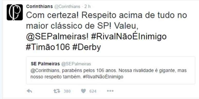 Agradecendo a gentileza, o Timão respondeu, também valorizando o respeito no tradicional clássico paulistano, definido pelo próprio perfil como o maior do estado de São Paulo.