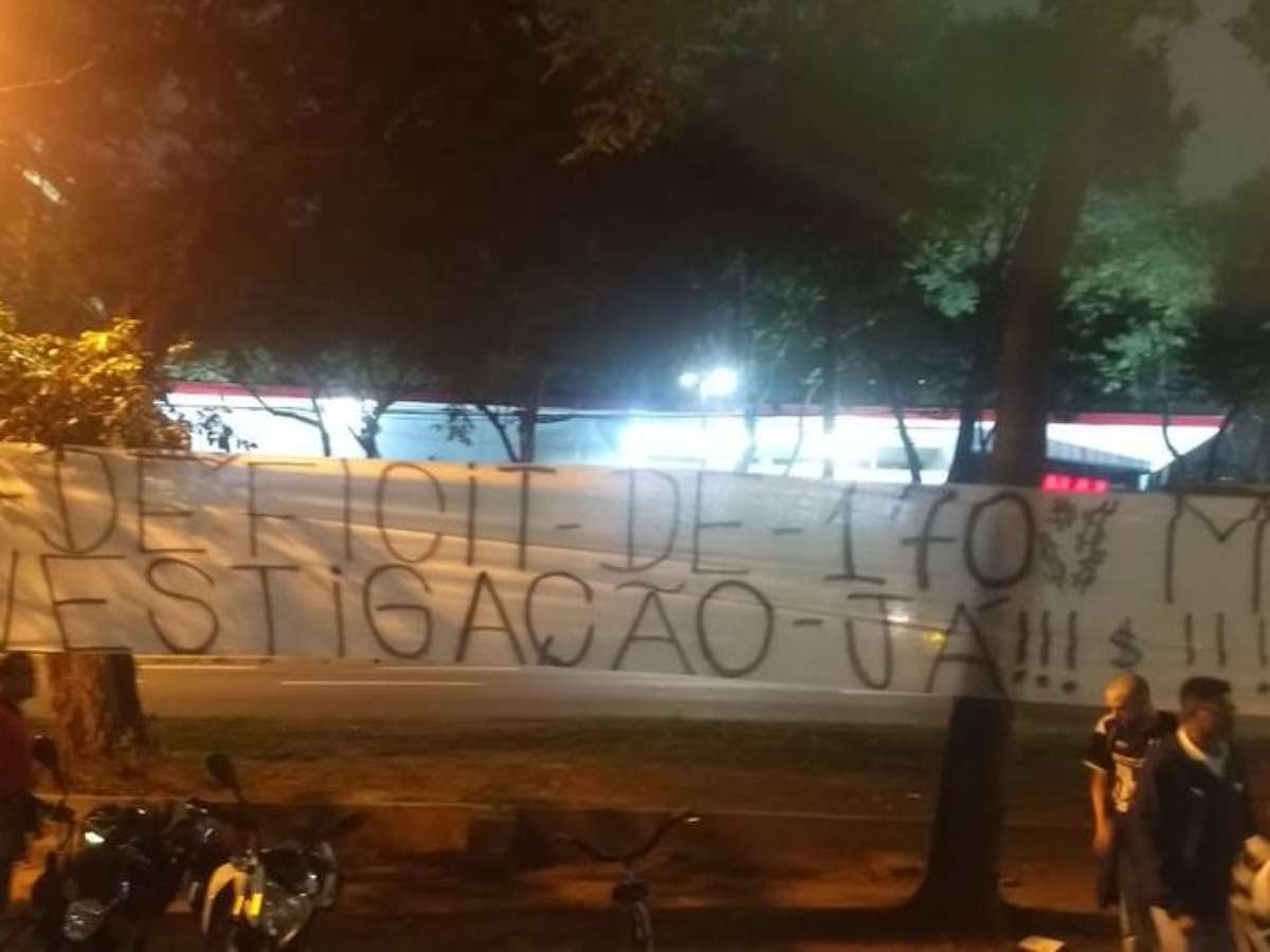 Uma das faixas colocadas no muro do clube também questionava a dificuldade enfrentada para pagar o estádio. "Arena de mármore, dívida impagável". Outra: "Clube quebrado dirigente milionário". Uma terceira lembrava do déficit na temporada passada. "Déficit de 170 milhões, investigação já."