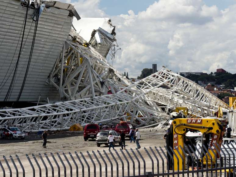 Parte da estrutura da Arena Corinthians desabou na manhã desta quarta-feira, após a queda de uma grua sobre a cobertura do estádio, sede paulista da Copa do Mundo de 2014