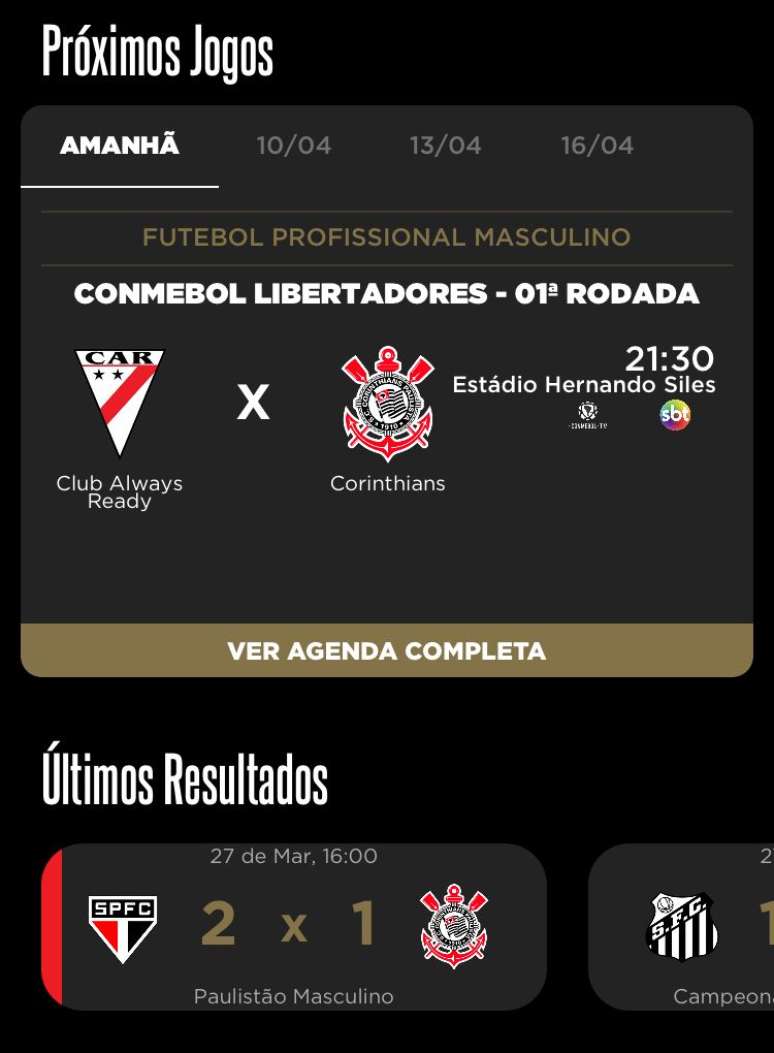 Aba para o torcedor se "programar", com calendário de jogos, últimos resultados, entre outros. (Foto: Reprodução)