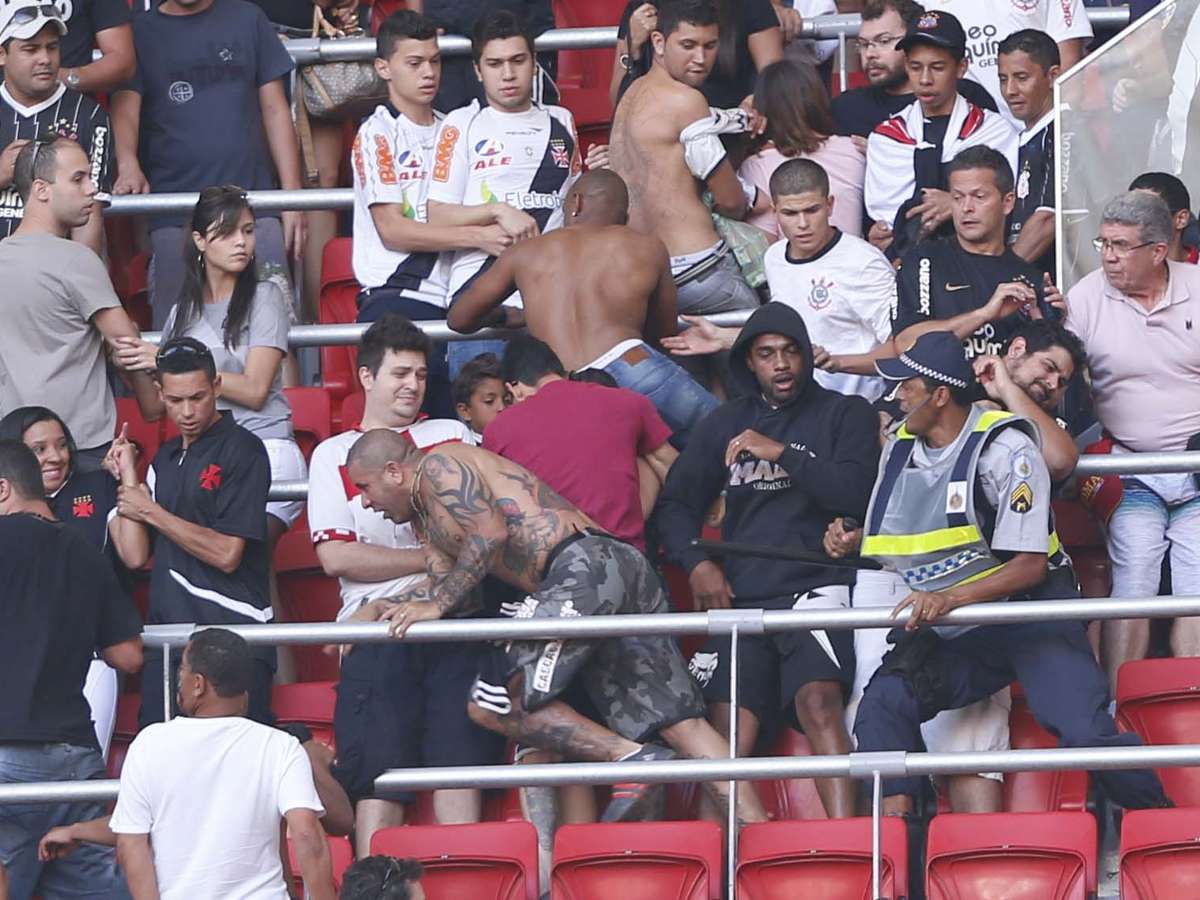 Duelo no Distrito Federal, em estádio que sediará a Copa do Mundo, foi marcado por briga nas arquibancandas entre torcedores dos dois times; organizadas de Vasco e Corinthians são rivais históricas, mas mesmo assim policiamento resolveu não adotar separações dentro do estádio