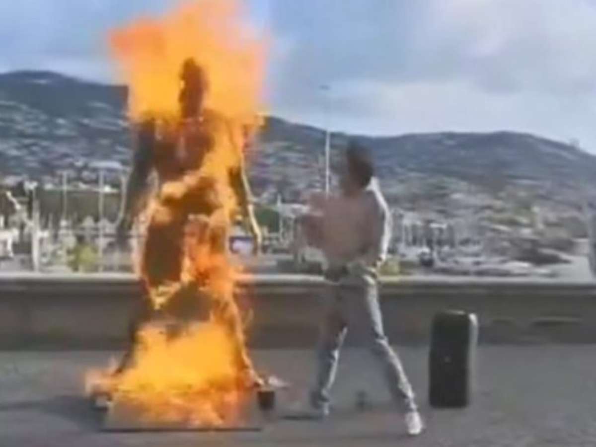 🇵🇹 | Na Madeira, individuo arde a estátua de Cristiano Ronaldo enquanto dança de felicidade.