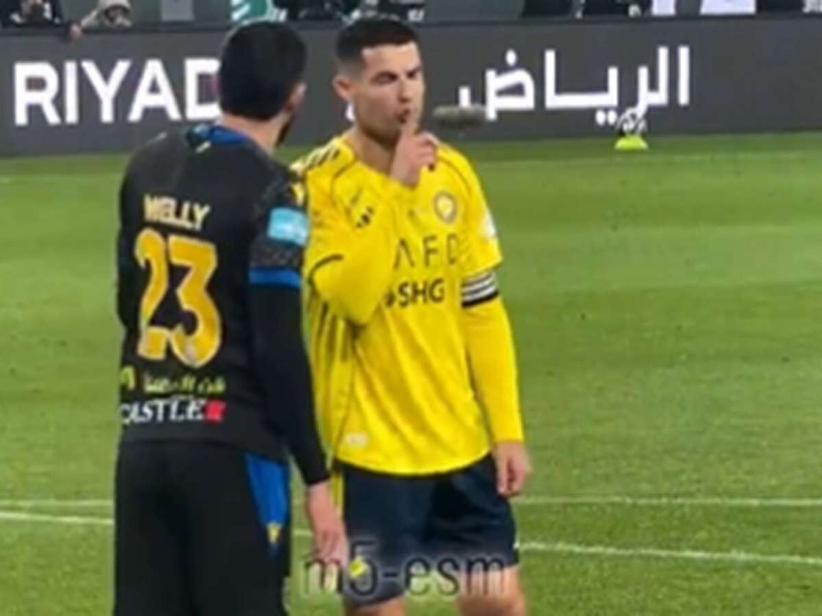 Durante uma jogada de bola parada, Cristiano Ronaldo discute com atletas do Al Taawon, entre eles Waleed Al-Ahmed e Mahzari. O português reage de forma exaltada à marcação próxima e bate-boca com os defensores, inclusive levando o dedo à boca pedindo silêncio.