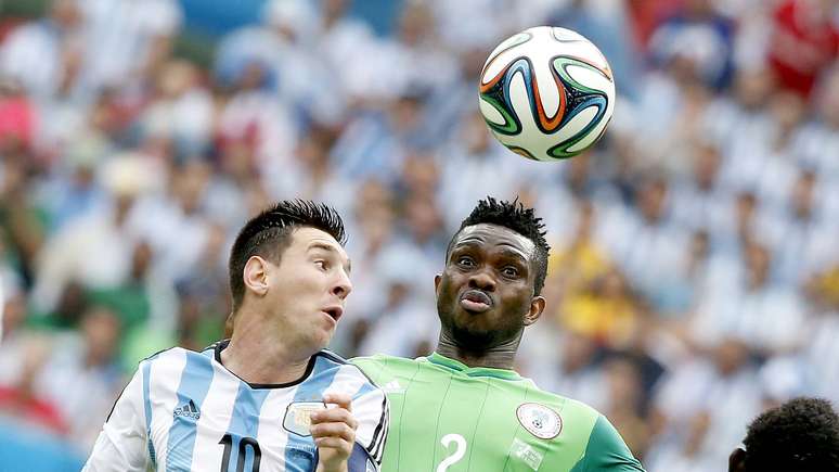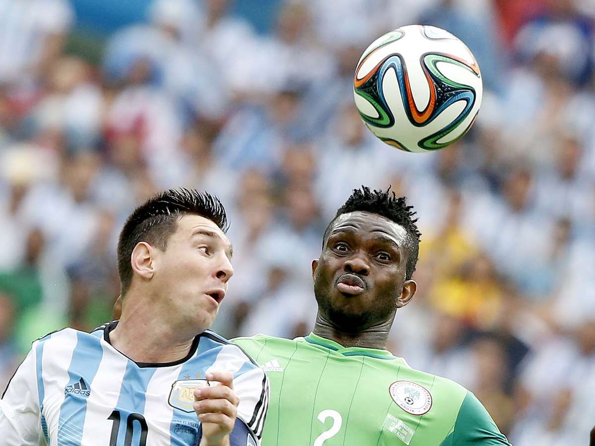 Messi e Yobo dividem bola durante jogo entre Argentina e Nigéria