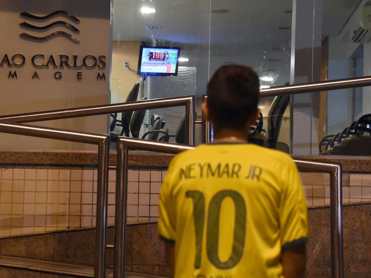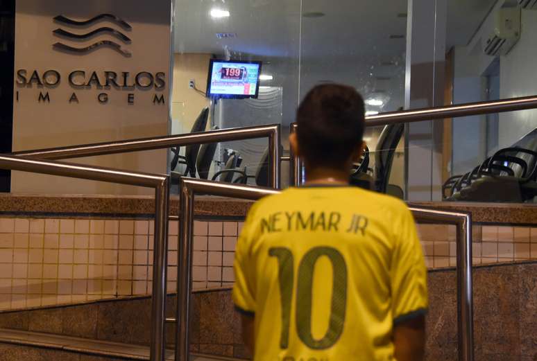 Torcedores se reúnem em frente ao Hospital São Carlos, em Fortaleza, para onde Neymar foi levado após lesão na partida contra a Colômbia na Arena Castelão. O jogador fraturou a terceira vértebra lombar e a recuperação levará cerca de quatro a seis semanas, o que o tira o do restante da Copa do Mundo. Neymar já deixou o hospital e deve seguir viagem ao Rio de Janeiro, junto ao grupo.