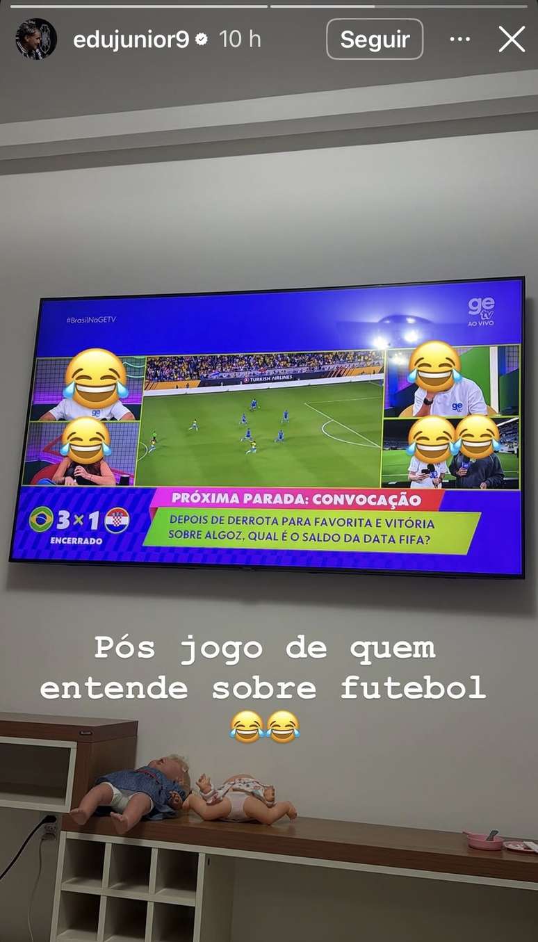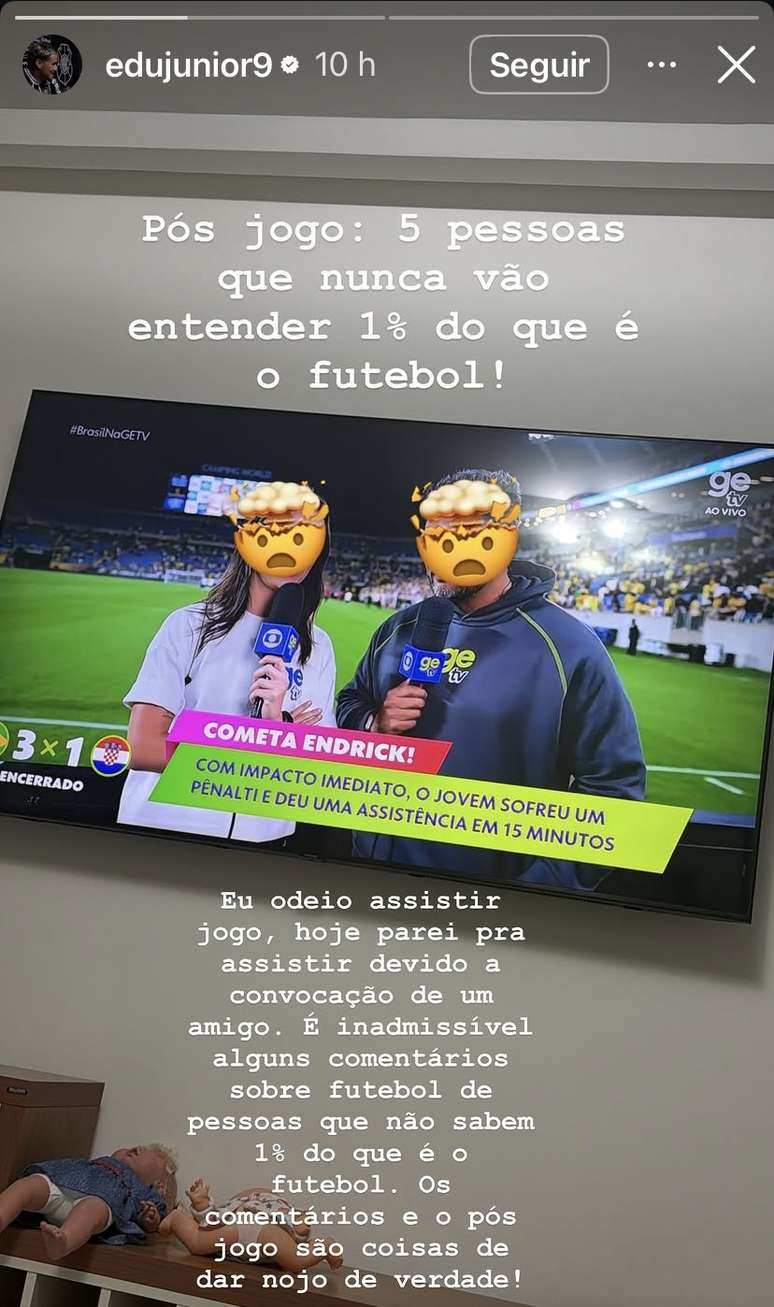 Na primeira publicação, Edu escreveu: "Pós jogo: 5 pessoas que nunca vão entender 1% do que é o futebol!". Em seguida, reforçou o tom das críticas: "Eu odeio assistir jogo, hoje parei pra assistir devido à convocação de um amigo. É inadmissível alguns comentários sobre futebol de pessoas que não sabem 1% do que é o futebol. Os comentários e o pós jogo são coisas de dar nojo de verdade!".