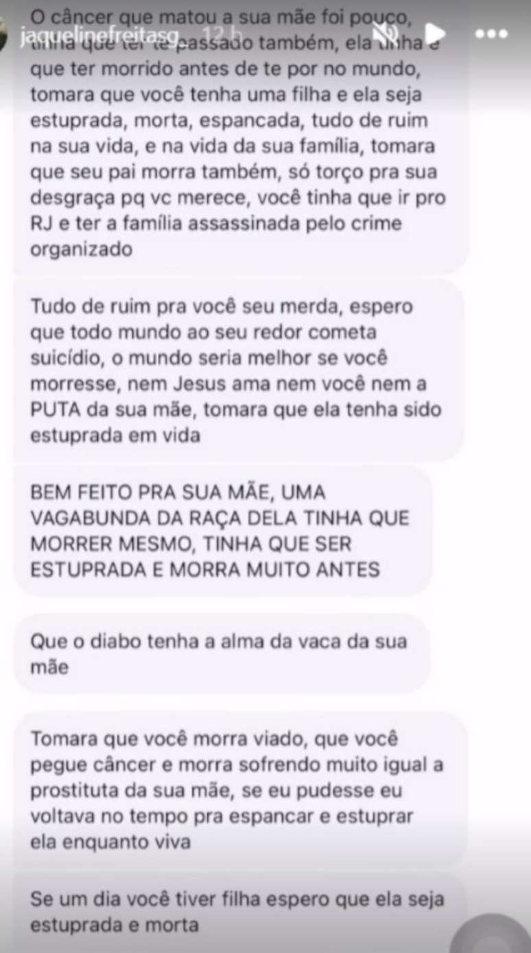 Os ataques ocorreram no direct do Instagram e tentaram o intimidar. O torcedor em questão usou a recente morte da mãe do jogador, no ano passado por câncer, para atingi-lo, dizendo que a doença "foi um castigo" por ele ser quem ele é. Entre diversos outros xingamentos, desejou que os parentes do goleiro fossem assassinados e que, se um dia ele tiver uma filha, ela deveria ter o mesmo destino.