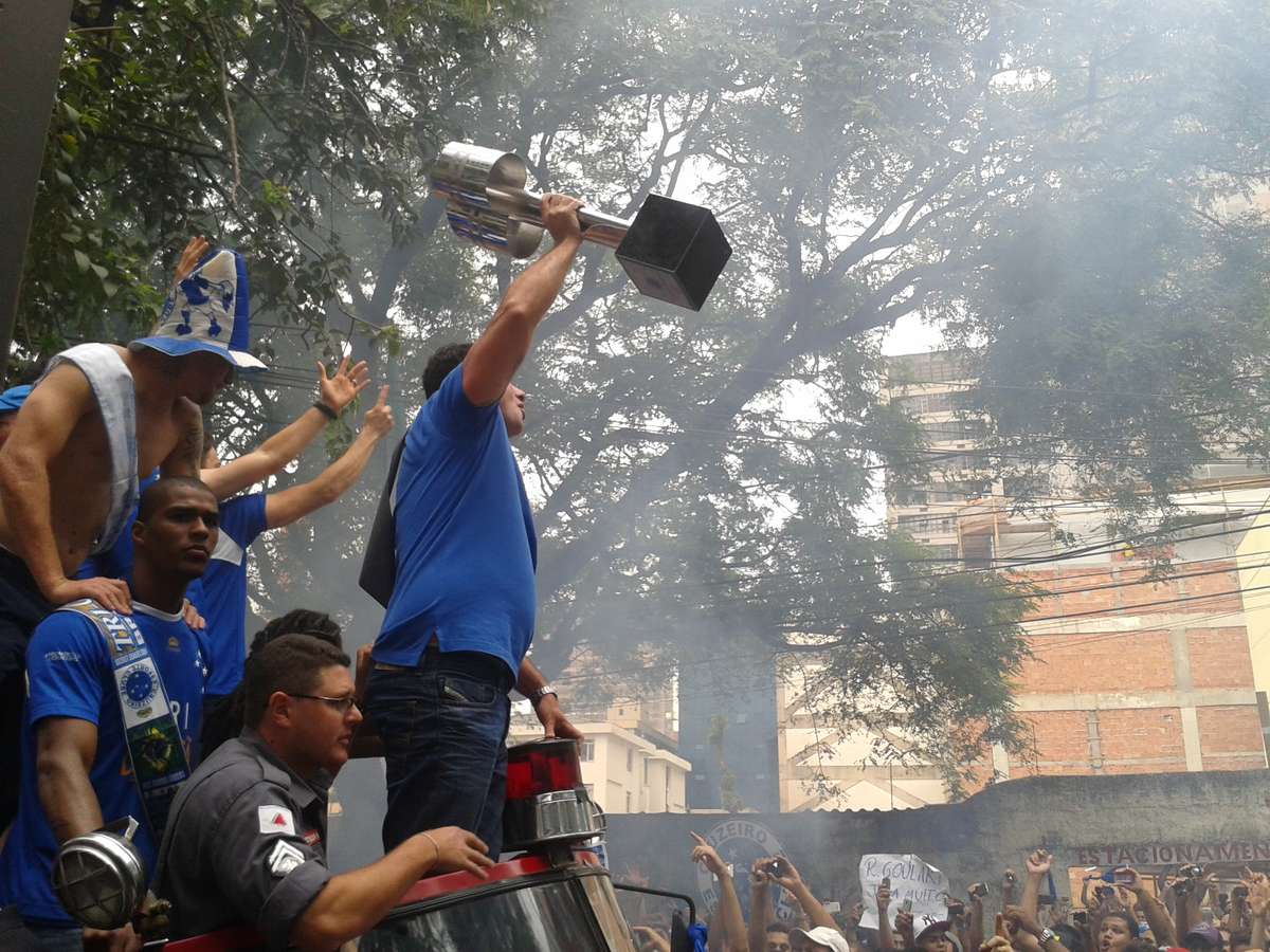 Após o desembarque na manhã desta quinta-feira, no aeroporto de Confins, na região metropolitana de Belo Horizonte, os jogadores do Cruzeiro desfilaram em dois carros de bombeiros pela capital mineira. A carreata teve início no fim da manhã e terminou por volta das 15h (de Brasília).