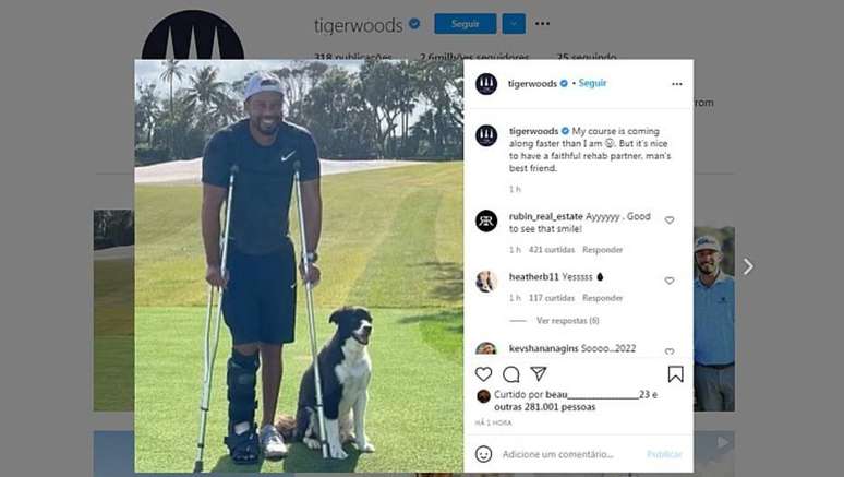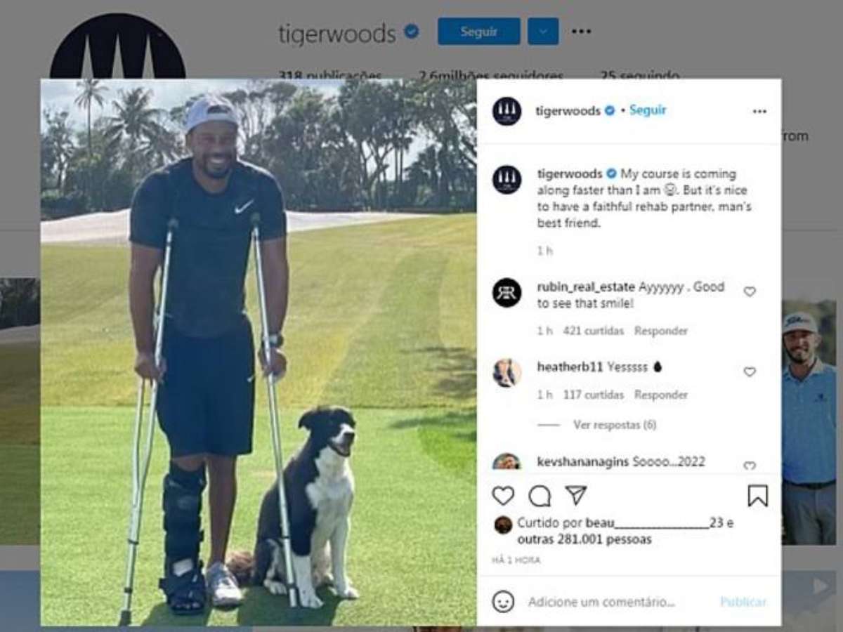 "Meu curso está indo mais rápido do que eu esperava", escreveu Tiger nas redes sociais. "Mas é bom ter um fiel parceiro de reabilitação, o melhor amigo do homem", disse o golfista, de 45 anos, parcialmente recuperado do acidente sofrido no sul da Califórnia.