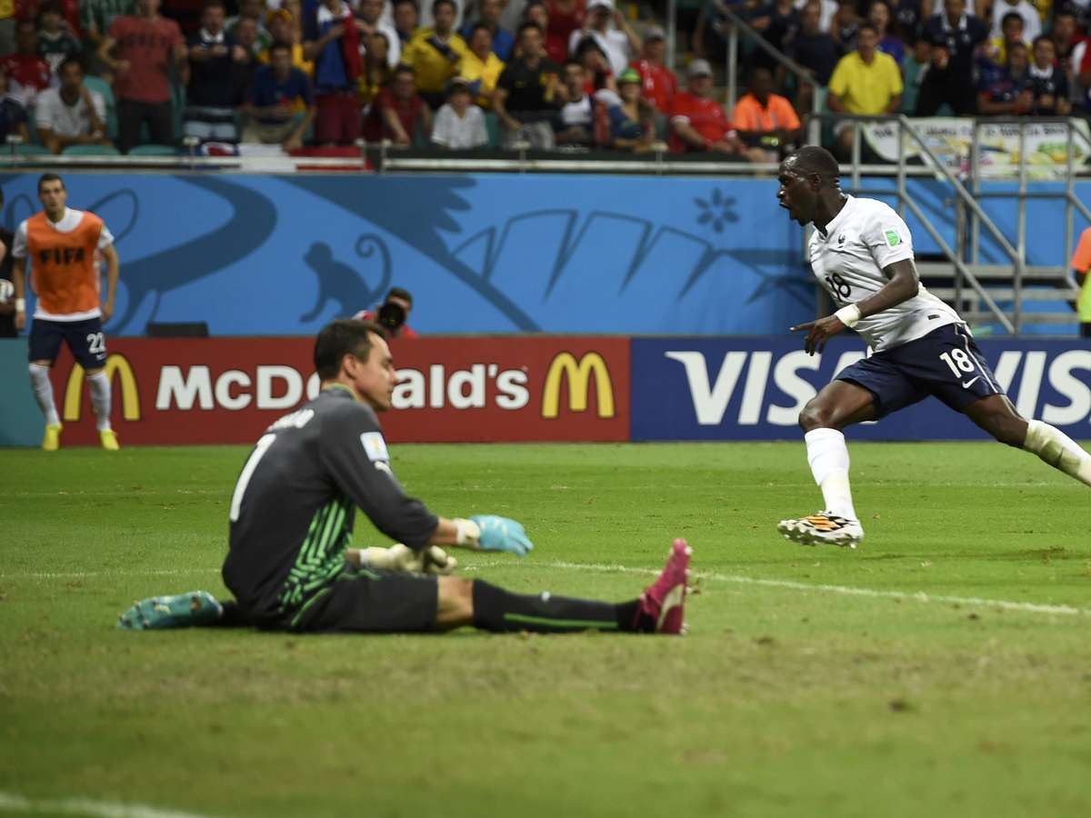 Benaglio observa a bola entrar no quinto gol francês, marcado por Sissoko