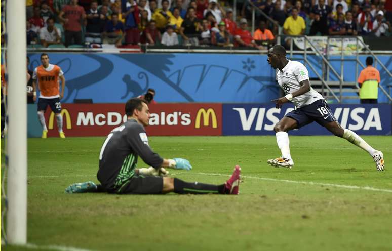 Sissoko comemora o quinto gol francês em partida contra a Suíça na Arena Fonte Nova