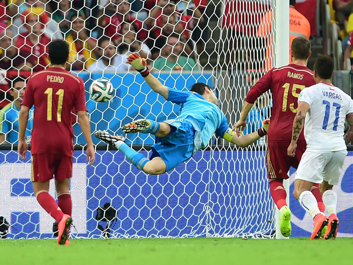 Goleiro espanhol Casillas corre atrás de tentativa do chileno Arturo Vidal