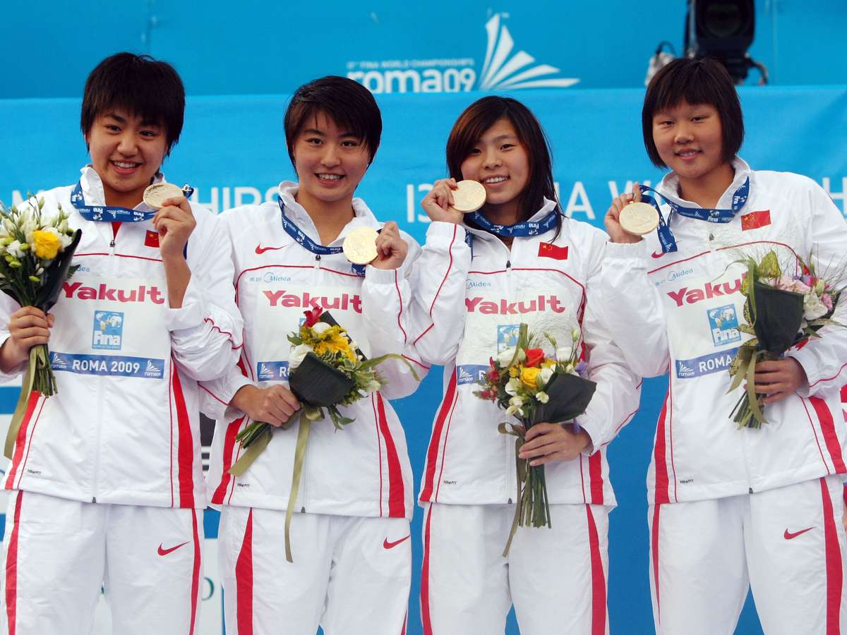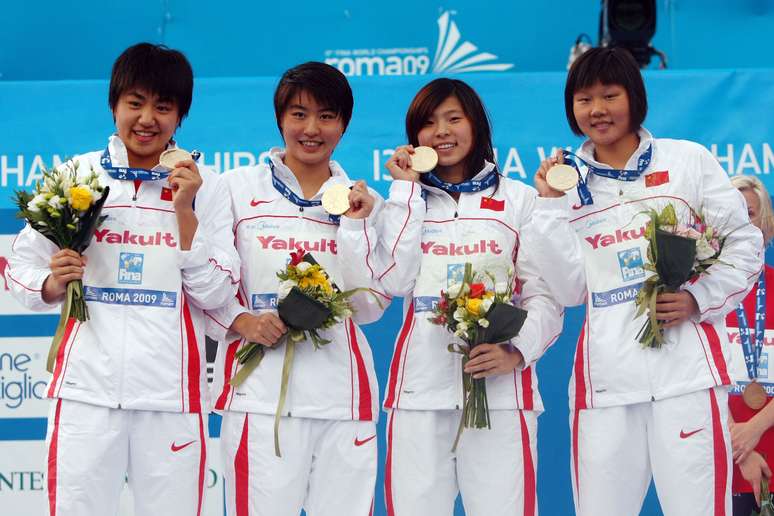 Zhao Jing, Chen Huijia, Jiao Liuyang e Li Zhesi (última à dir.) celebram ouro no Mundial de Roma, em 2009
