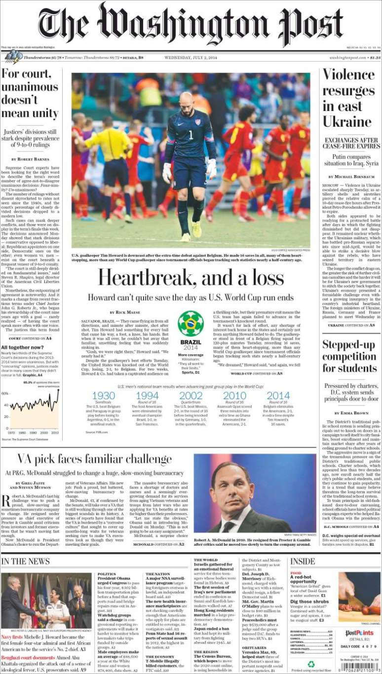 The Washington Post (Columbia) "Coração partido e derrota: Howard não consegue salvar o dia, e a caminha da Copa do Mundo termina para os EUA"