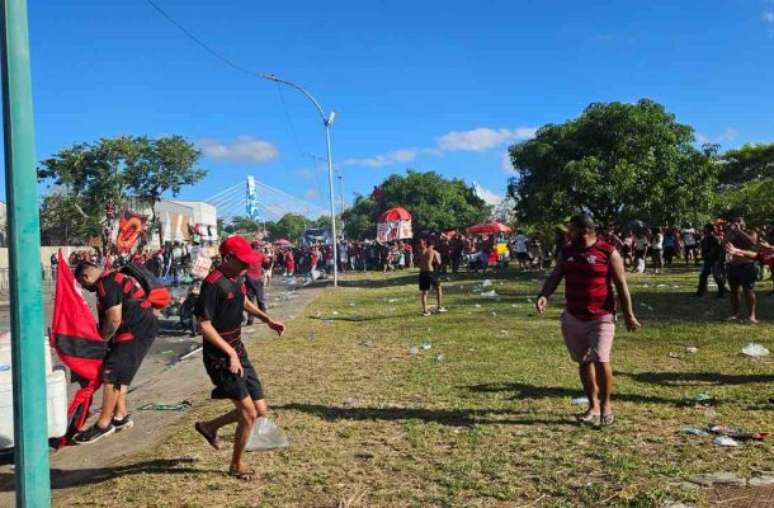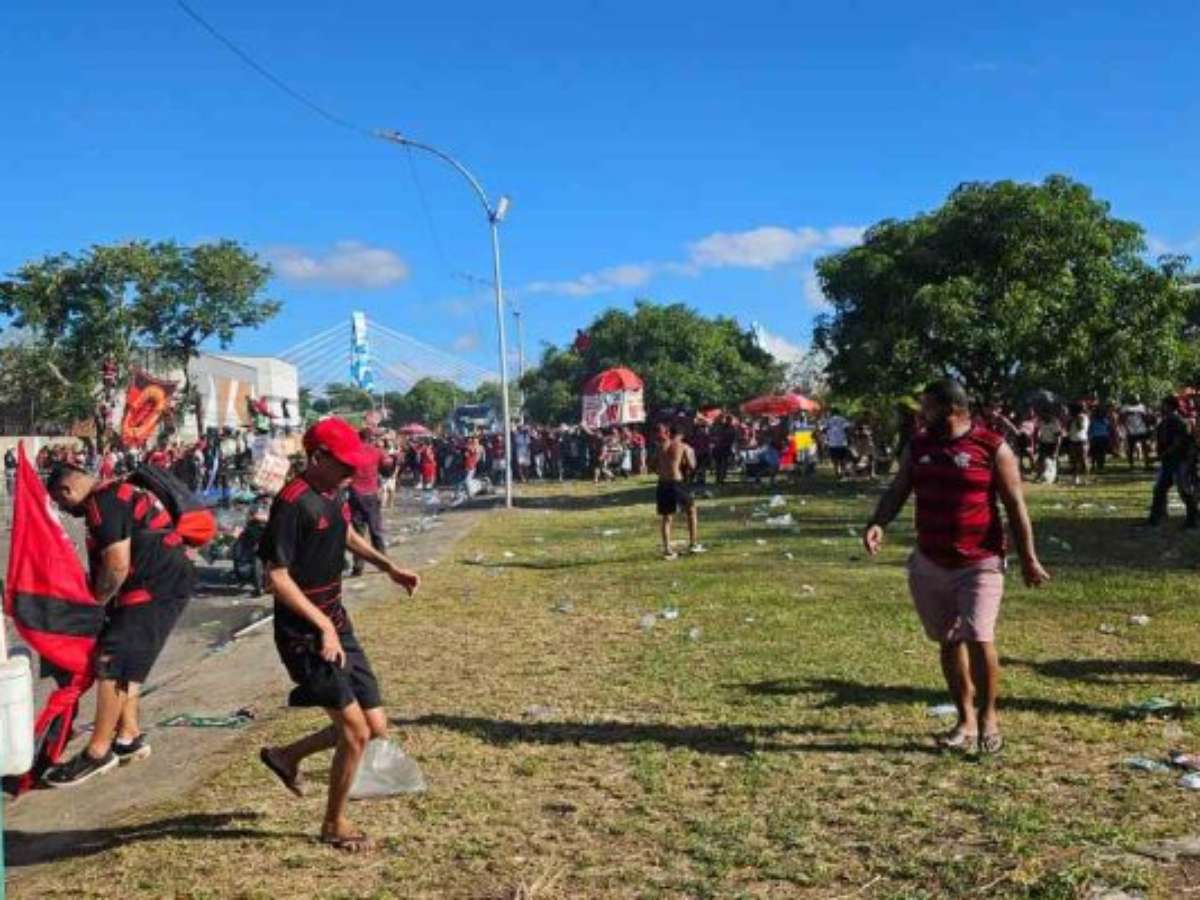Antes do embarque, a torcida e os próprios os jogadores viram um momento de tensão no Rio de Janeiro. A Linha Amarela, uma das principais vias da cidade, teve de ser interditada por causa de um confronto entre policiais e criminosos nesta quarta-feira (26). A Polícia Militar, assim, destacou 345 policiais exclusivamente para escoltar a delegação do Flamengo e reforçar a segurança dos torcedores.