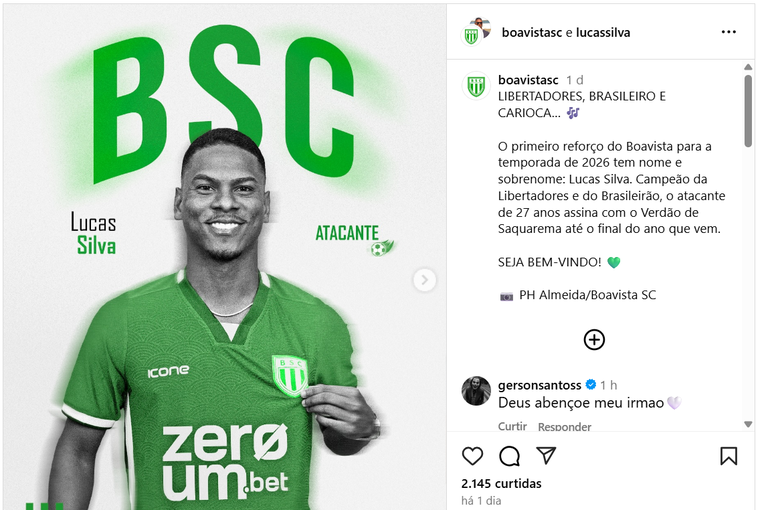'O primeiro reforço do Boavista para a temporada de 2026 tem nome e sobrenome: Lucas Silva. Campeão da Libertadores e do Brasileirão, o atacante de 27 anos assina com o Verdão de Saquarema até o final do ano que vem', publicou o clube.