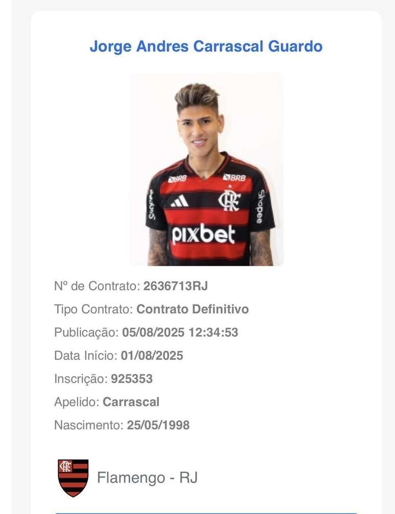 O Flamengo pode ter mais um reforço para o duelo contra o Mirassol, no sábado (9), às 18h30 (de Brasília), pela 19ª rodada do Campeonato Brasileiro. O colombiano Jorge Carrascal teve seu nome publicado no Boletim Informativo Diário (BID) da CBF e está apto para atuar pelo Rubro-Negro.