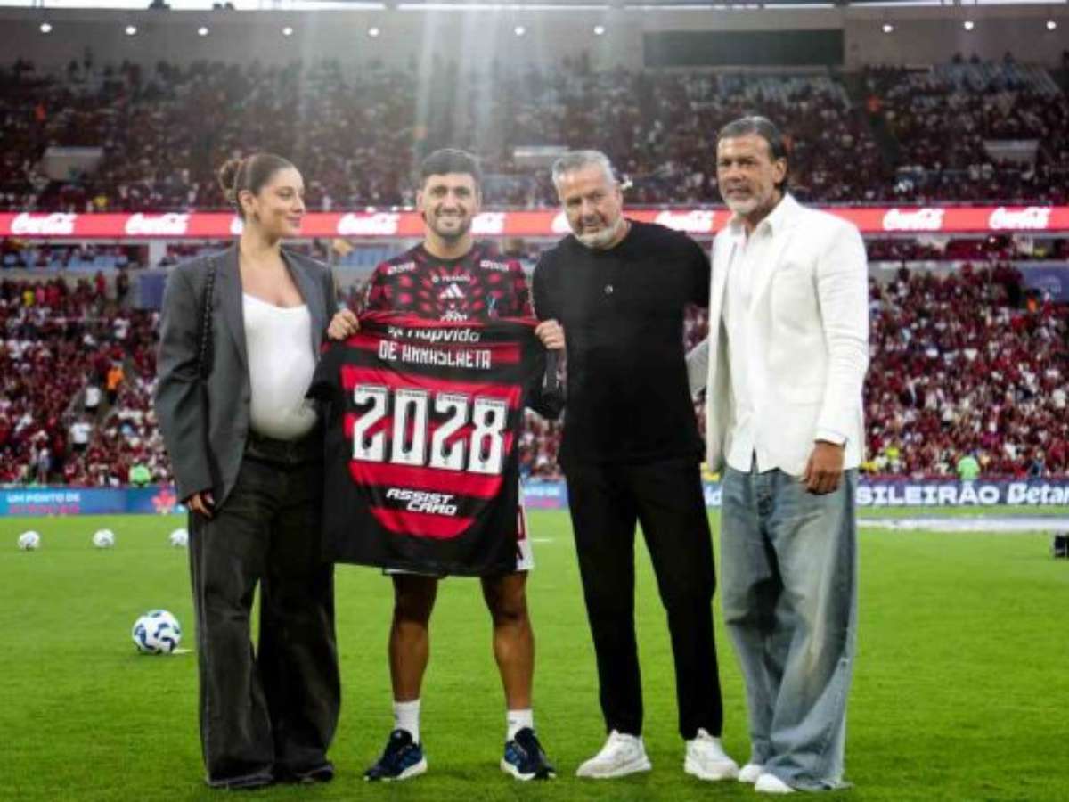 O Flamengo celebrou o novo contrato de Giorgian de Arrascaeta neste domingo (9/11), em cerimônia realizada no gramado do Maracanã, pouco tempo antes do aquecimento para o duelo contra o Santos, pela 32ª do Brasileirão. Acompanhado da família, Arrasca recebeu uma camisa do Fla com o número 2028, que faz alusão ao ano de término de seu novo vínculo com a equipe onde é ídolo, e um mini manto para o seu filho, pois a sua esposa Camilla Bastiani está grávida de quase oito meses. A entrega foi realizada através do diretor de futebol do clube, José Boto.