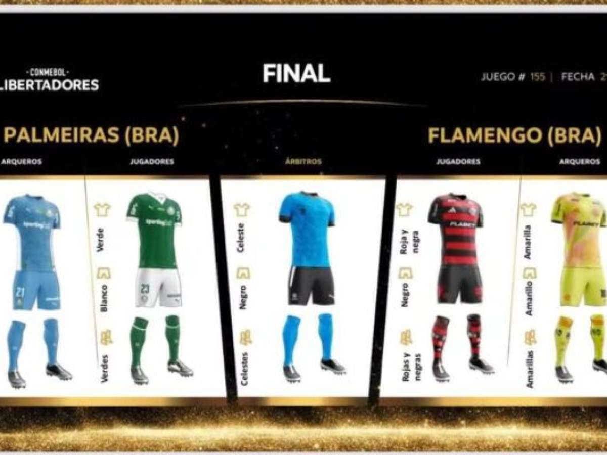 A Conmebol definiu nesta segunda-feira (3) os uniformes dos finalistas da Libertadores. Dessa forma, o Palmeiras vai a campo vestindo a tradicional camisa verde, enquanto o Flamengo jogará de rubro-negro. A combinação, portanto, é diferente da decisão de 2021. O Alviverde e o Rubro-Negro decidem o título continental no próximo dia 29, em Lima, no Peru.