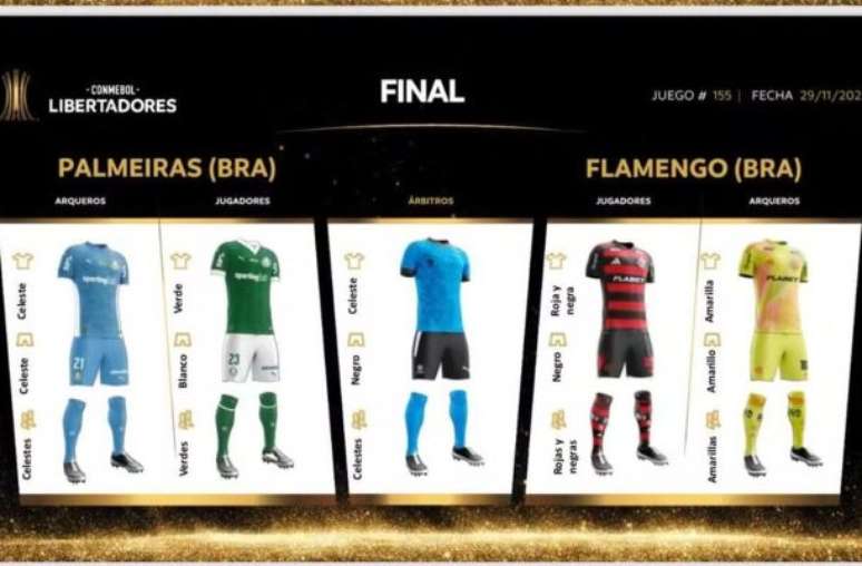 A combinação é diferente da decisão de 2021. Na época, a Conmebol determinou que o Palmeiras usasse a mesma peça de 2025, enquanto o Flamengo utilizou camisa e meião brancos, além de short preto. Agora, os times vão se enfrentar utilizando suas principais camisas, colocando em campo toda a tradição da maior rivalidade do futebol brasileiro nos últimos anos.
