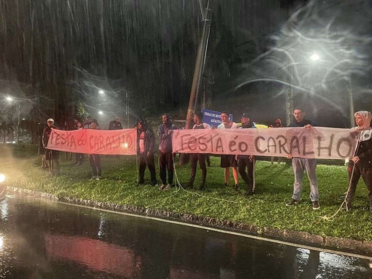 Em um canteiro localizado na porta do condomínio onde ocorre a festa, na Barra da Tijuca, Zona Oeste do Rio, cerca de uma dezena de torcedores se concentravam no começo da noite desta terça. O grupo gritava palavras de ordem contra Gabigol e também dirigentes do Flamengo, além de carregar faixas. Nelas, liam-se dizeres como 'Festa é o c.'.