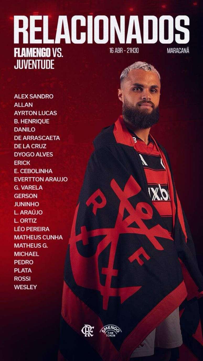 Líder do Brasileirão, o Flamengo volta a campo nesta quarta-feira (16) para medir forças com o Juventude, às 21h30 (de Brasília), pela quarta rodada. Diante disso, o clube divulgou os relacionados para o duelo e confirmou o atacante Bruno Henrique como opção para Filipe Luís. O jogador, afinal, foi indiciado pela Polícia Federal por supostamente ter forçado um cartão amarelo em 2023.