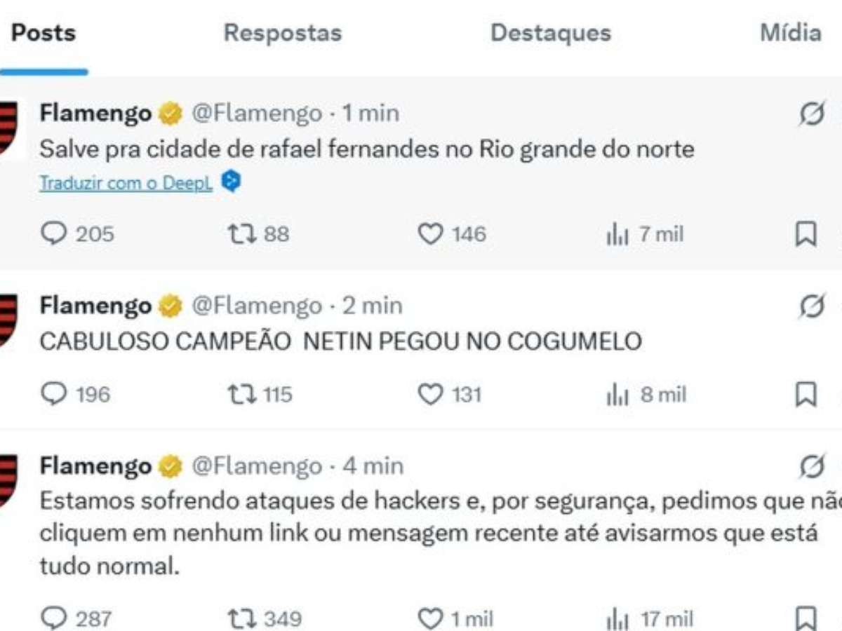 Uma outra postagem pedindo pix também foi deletada pela conta rubro-negra. Posteriormente, outras duas mensagens (essas, sem golpes) apareceram na timeline do X do Fla. Até o momento da publicação, o Flamengo não voltou a se pronunciar sobre o ataque dos hackers. Naturalmente, os administradores da conta paralisaram a cobertura em "tempo real" da final contra o Lanús, pela Recopa. É de praxe a conta rubro-negra cobrir os jogos do time profissional, contabilizando gols, cartões e outros lances chamativos.