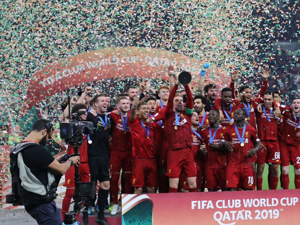 Time do Liverpool comemora título de campeão durante a partida entre Flamengo e Liverpool, válida pela final do Mundial de Clubes FIFA 2019, no Estádio Khalifa Internacional em Doha no Catar, neste sábado (21).