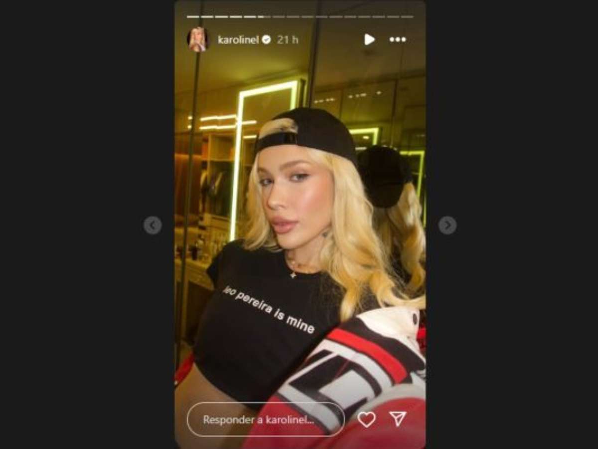 A influencer, portanto, costuma personalizar roupas nas cores do clube carioca para acompanhar os jogos. Dessa forma, ela 'inovou' no look escolhido para a partida. Karoline foi com um cropped com a frase "Léo Pereira é meu", escrita em inglês, como ela mostrou em seu Instagram.