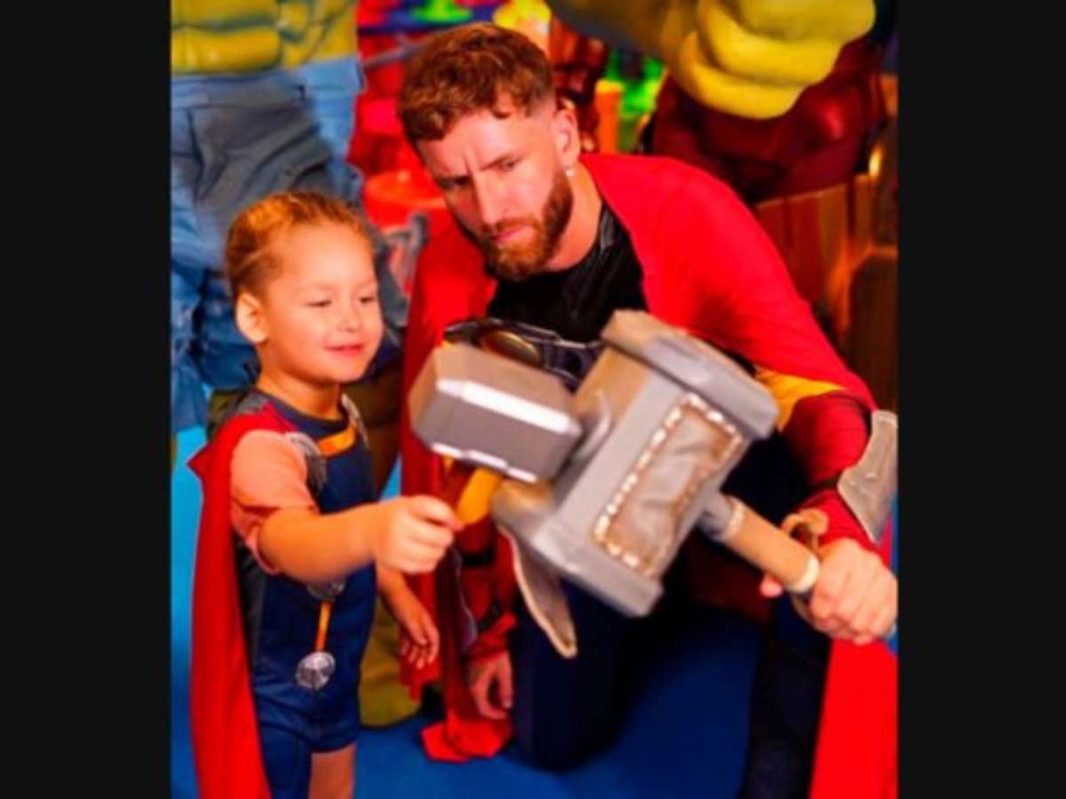 Com a vestimenta de Thor, super-herói da Marvel, Léo Pereira tem entrada triunfal no aniversário de Matteo, seu filho mas comete gafe