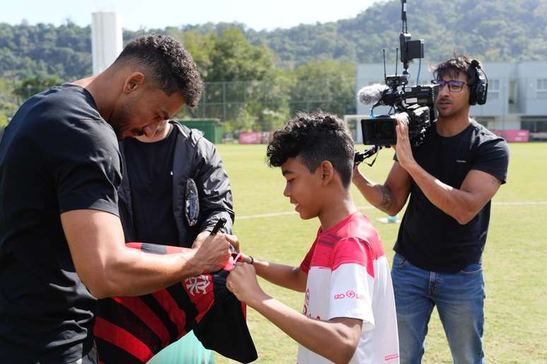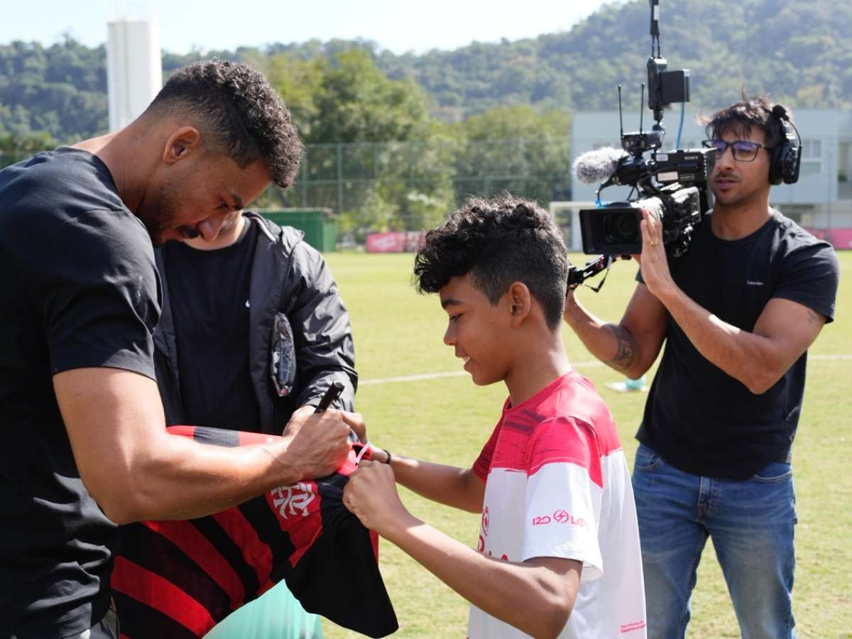 Derick, campeão, fez a primeira pergunta durante a visita ao projeto do craque Danilo, que fez o gol do título da Libertadores para o Flamengo
