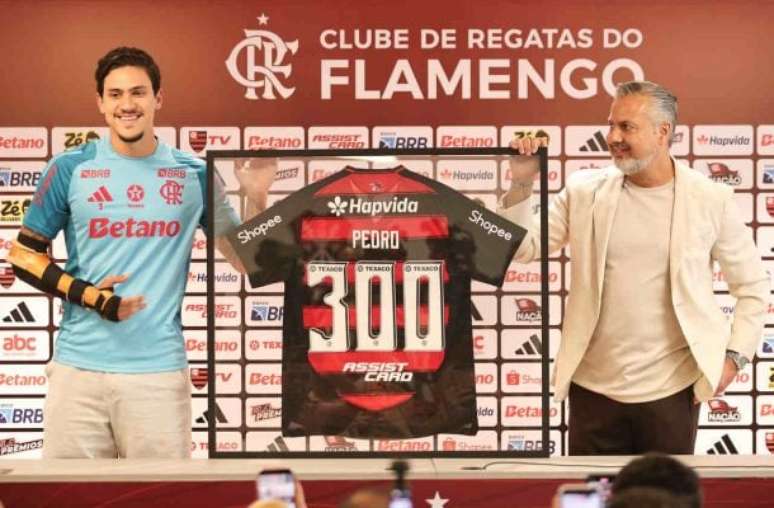 O dia foi movimentado no Flamengo. Além da coletiva antes do treino no Ninho do Urubu, o Rubro-Negro homenageou nesta segunda-feira (3/11) dois jogadores importantes do elenco. Ayrton Lucas e Pedro receberam quadros com camisas do clube com os números 200 e 300, respectivamente. As numerações dizem respeito à quantidade de partidas que os atletas angariaram atuando pela equipe carioca. O diretor executivo José Boto, aliás, entregou pessoalmente os objetos.