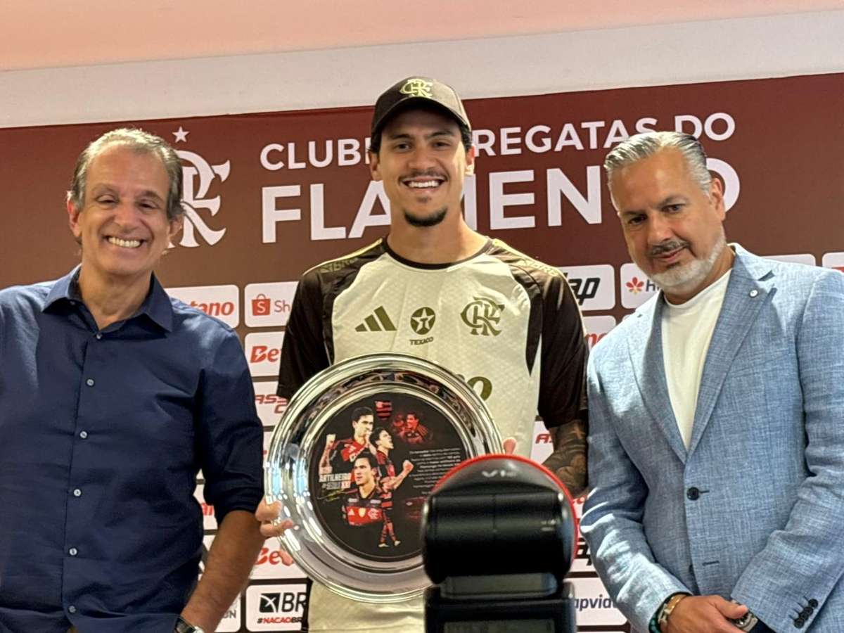 O Flamengo realizou uma homenagem especial ao atacante Pedro na reapresentação do elenco nesta terça-feira, no Ninho do Urubu. O camisa 9 recebeu uma placa das mãos do presidente Bap e do diretor de futebol José Boto após alcançar uma marca histórica: tornar-se o maior artilheiro do clube no século.