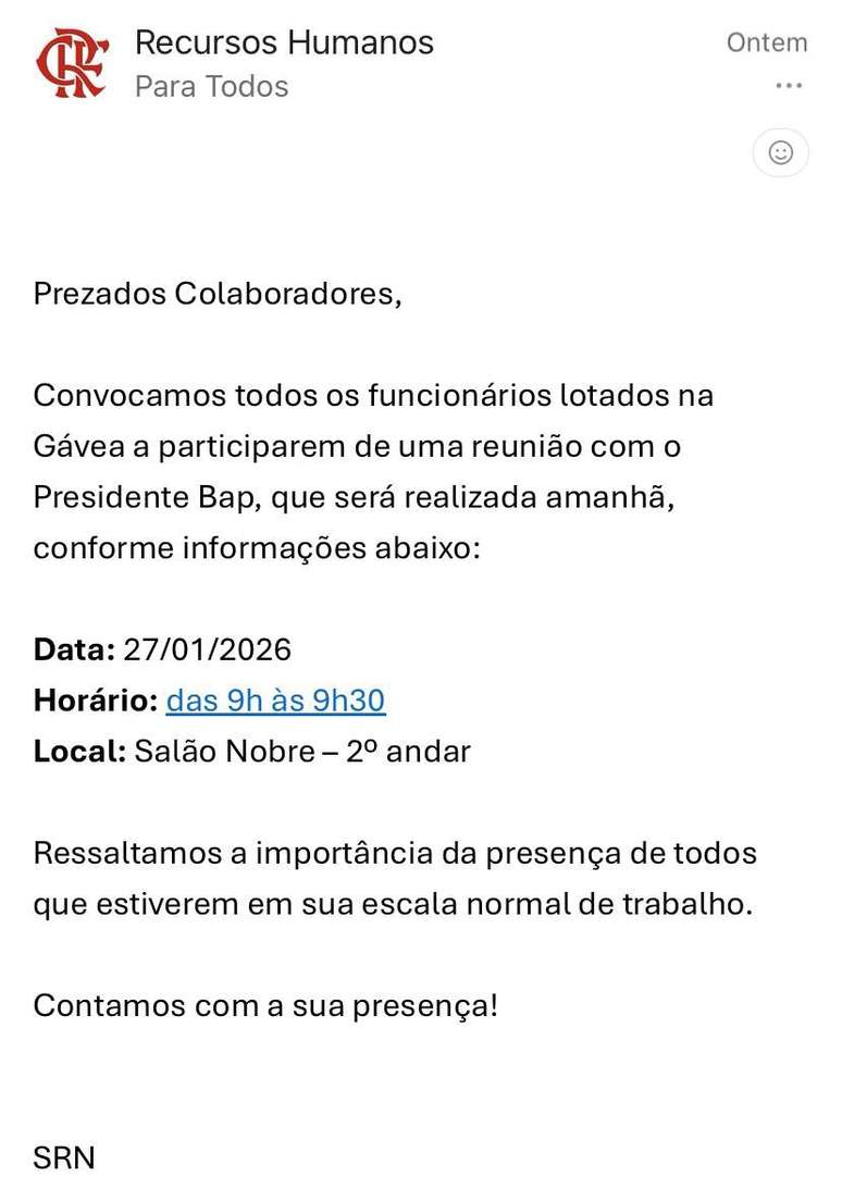 O clima de expectativa tomou conta da Gávea nesta terça-feira, 27 de janeiro de 2026. Segundo apuração do jornalista Venê Casagrande, o presidente do Flamengo, Bap, interrompeu a rotina do clube e convocou uma reunião com todos os colaboradores, do setor de limpeza à diretoria executiva.