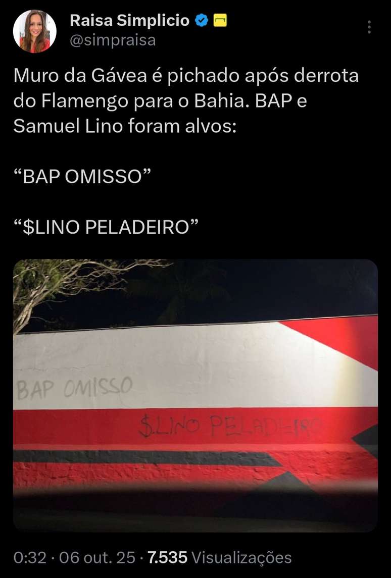 Na noite deste domingo, torcedores do Flamengo fizeram protesto contra o clube. O muro da sede do clube na Gávea, Zona Sul do Rio de Janeiro, foi alvo de pichação após a derrota rubro-negra para o Bahia por 1 a 0, horas antes, fora de casa, pelo Campeonato Brasileiro.