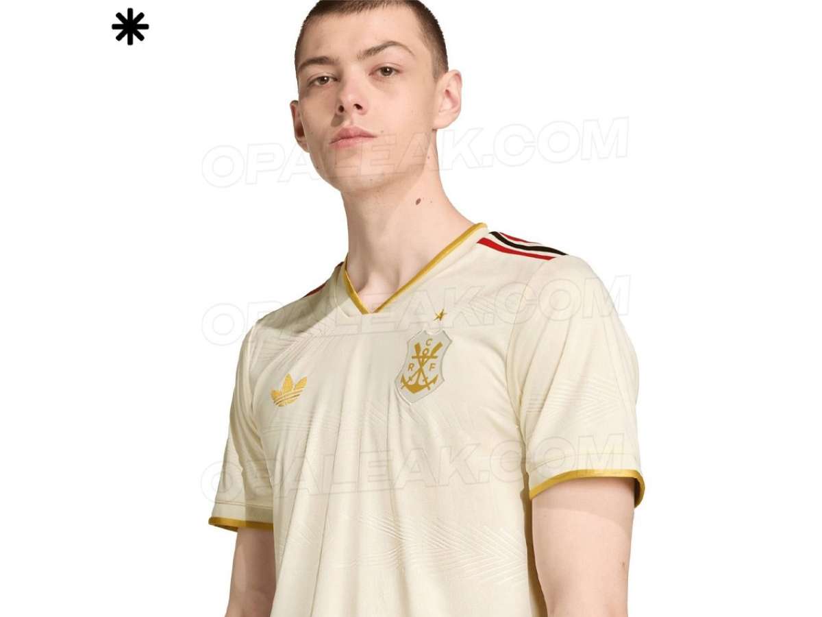 A nova camisa do Flamengo tem cor creme, escudo estilizado em dourado e logo retrô da Adidas na mesma cor. Possui gola em V e punhos com acabamento dourado. Três listras aparecem nos ombros em preto com detalhes vermelhos. O tecido conta com estampa em relevo com formas geométricas, e a famosa estrela acima do escudo, na cor dourada, que representa o título mundial de 1981.