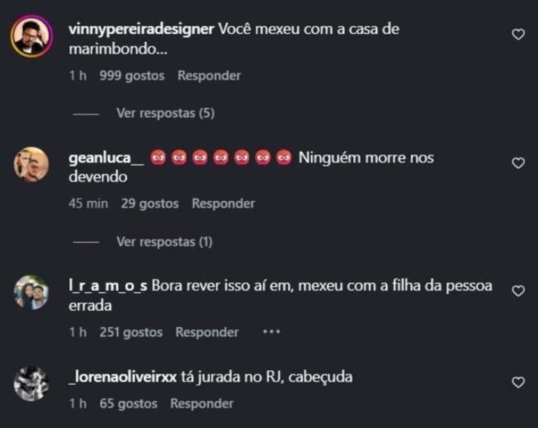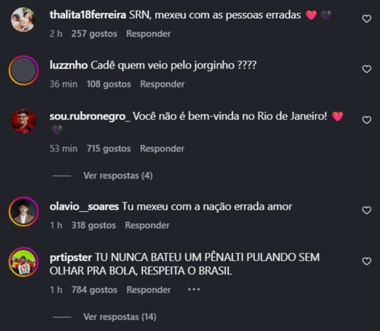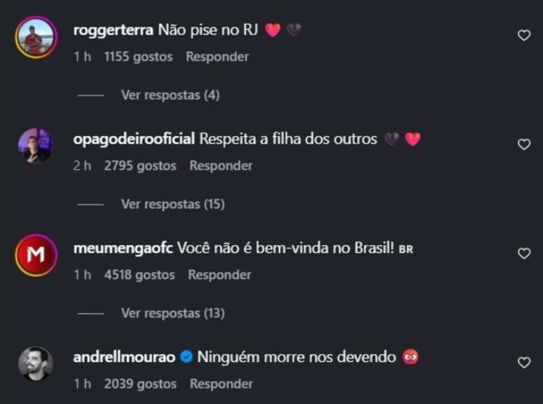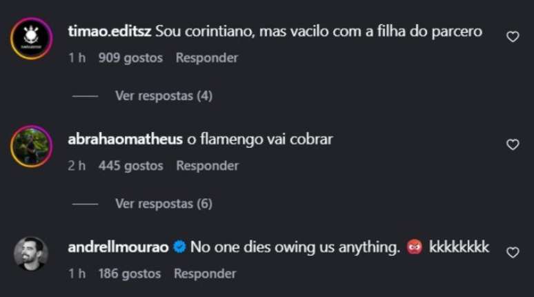 Não foram só os flamenguistas que se manifestaram no perfil da artista. No meio das mensagens, um torcedor do Corinthians também se colocou ao lado do jogador: "sou corintiano, mas vacilo com a filha do parceiro".