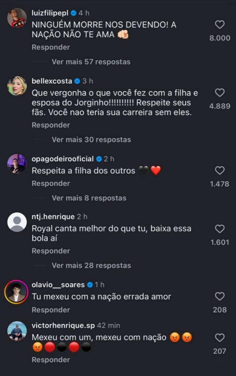 "Que vergonha o que você fez com a esposa e a filha do Jorginho. Respeite seus fãs, você não teria sua carreira sem eles", criticou uma usuária. Alguns comentários tiveram tom de brincadeira, mas sem esquece do apoio ao volante. "(Emerson) Royal canta melhor que você", zombou internauta. "Tá jurada no Rio de Janeiro", disse outro.