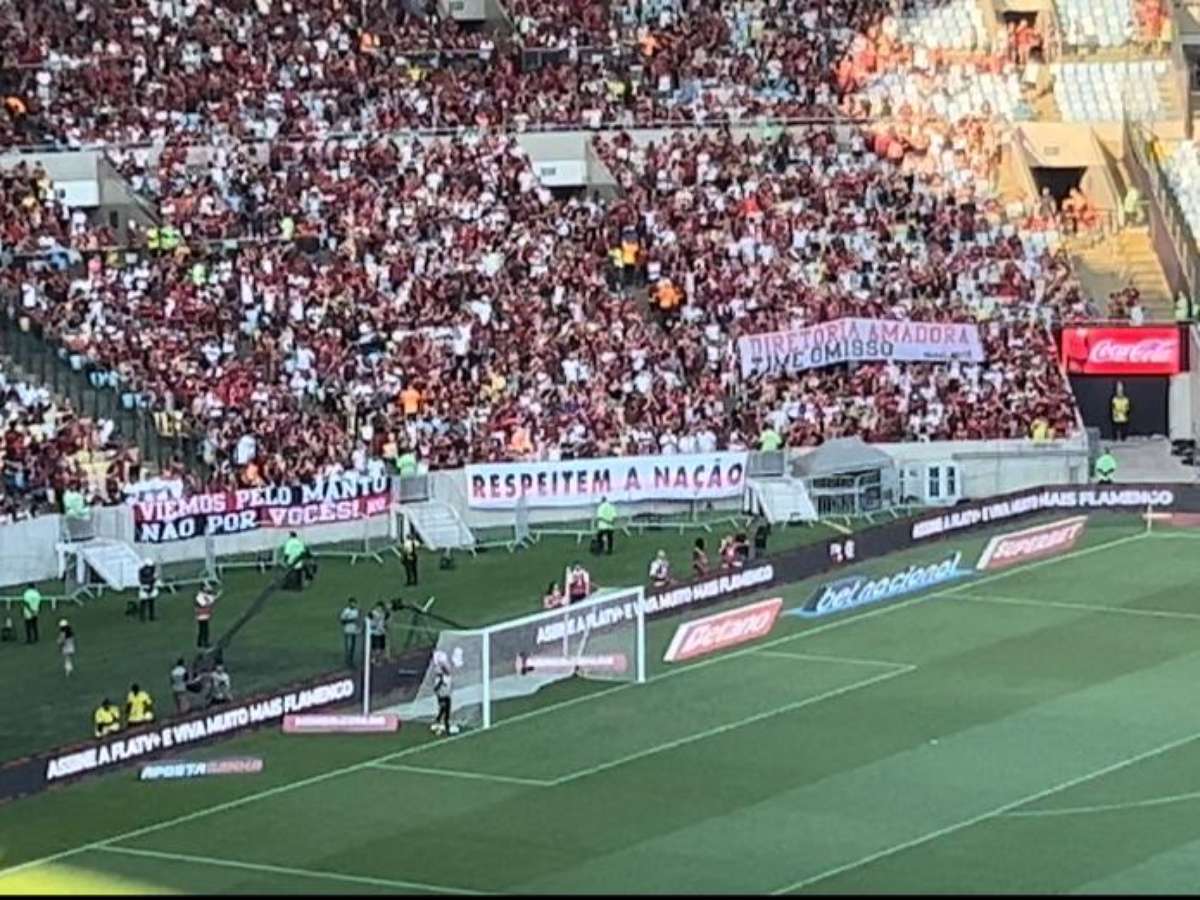 Faixas com os dizeres 'Respeitem a Nação', 'Viemos pelo manto, não por vocês' e 'Diretoria amadora, time omisso' integraram o protesto no setor Norte. Além disso, os cantos puxaram pela torcida organizada foram em tom de manifestação com a atual fase do clube.