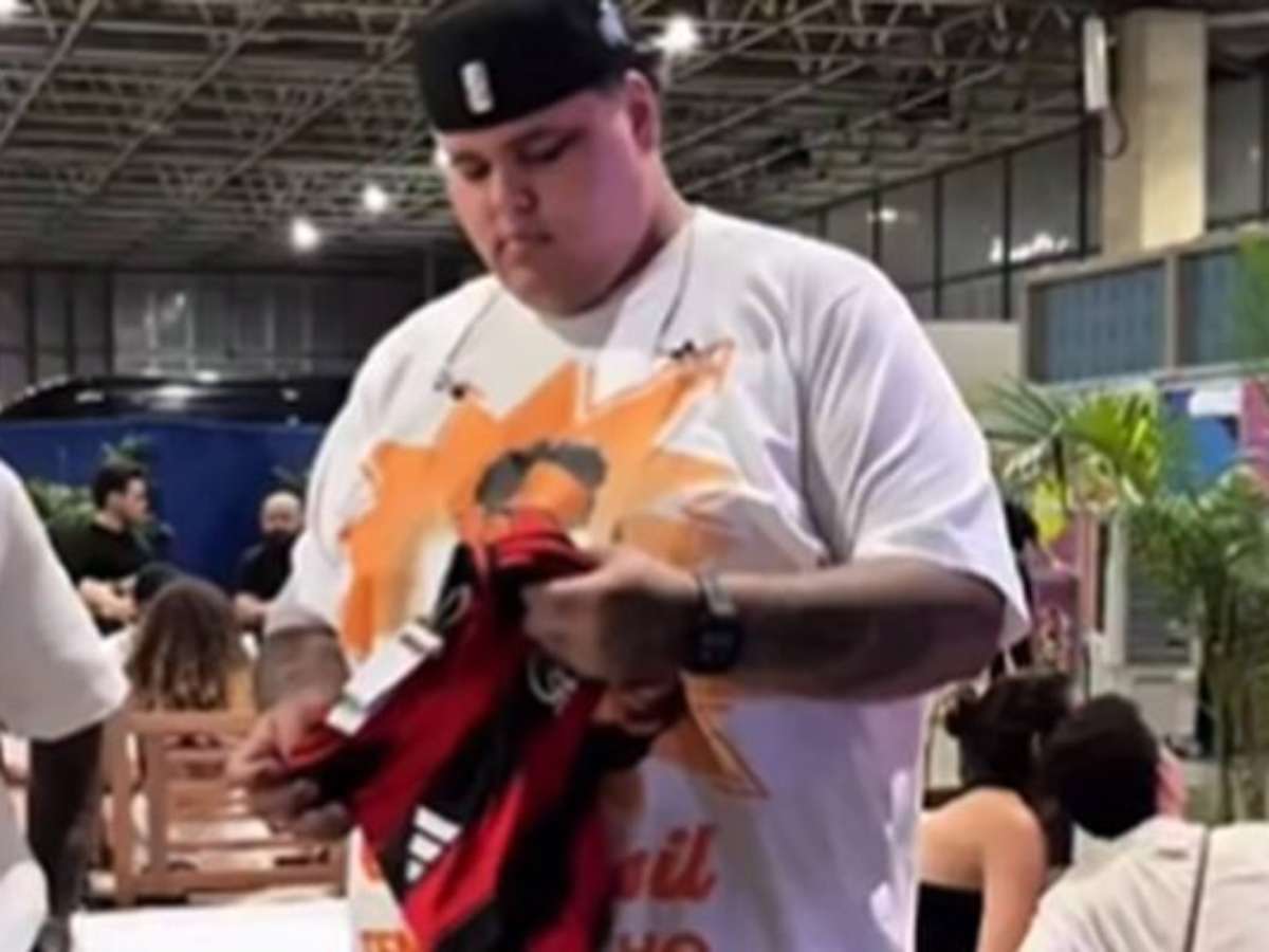 O encontro entre Ryan Roberto, uma das principais joias recentes do Flamengo, e Duzão, vocalista do grupo Menos é Mais, ganhou as redes sociais. Isso porque o jovem atleta entregou ao cantor uma camisa rubro-negra personalizada, com seu nome e número, e o momento foi divulgado por grandes veículos.