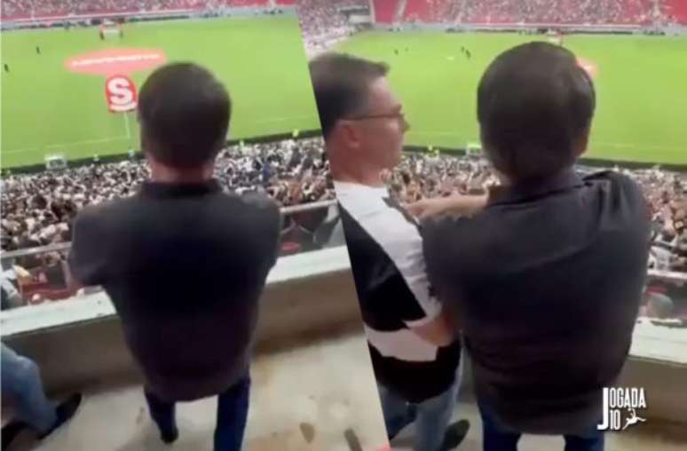Já outro vídeo, este gravado por trás de Bolsonaro, mostrava um clima antagônico, quase de devoção à sua presença. O registro mostra-o sendo ovacionado por torcedores, que o chamavam de "mito" e acenavam em sua direção.