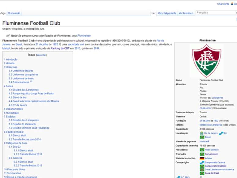 “Fluminense Football Club é uma agremiação polidesportiva e cultural, tricampeã no tapetão (1996/2000/2013), sediada na cidade do Rio de Janeiro, no Brasil, fundada a 21 de julho de 1902”, diz o texto sobre o clube na Wikipedia.