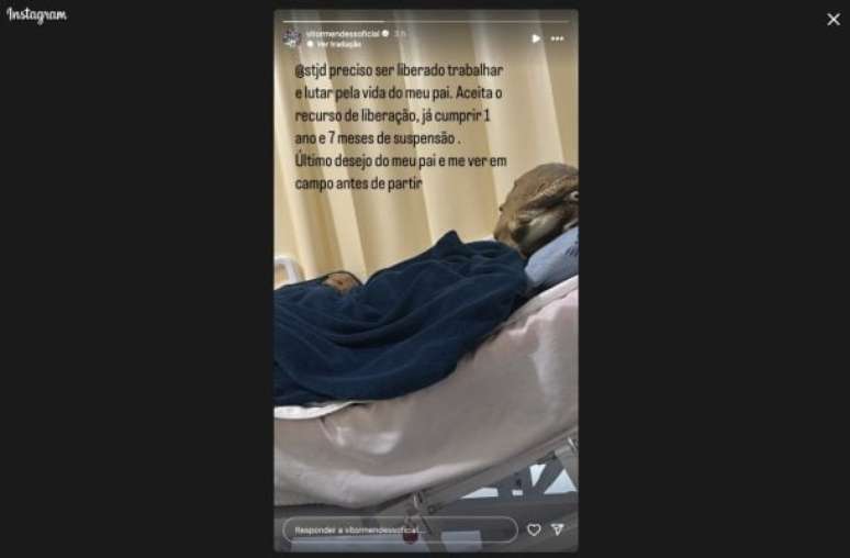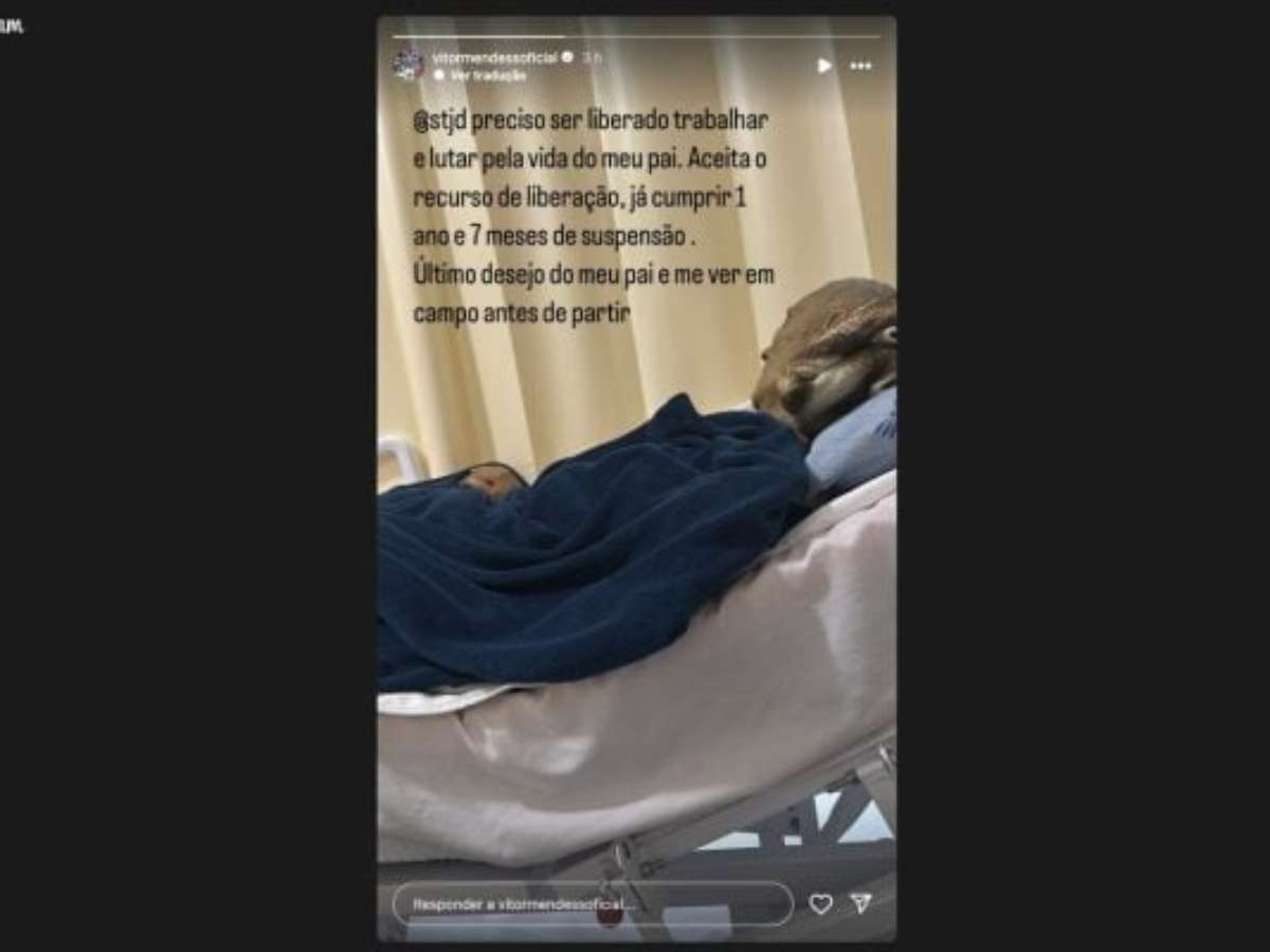"STJD, preciso ser liberado para trabalhar e lutar pela vida do meu pai. Aceite o recurso de liberação, já cumpri um ano e sete meses de suspensão. O último desejo do meu pai é me ver em campo antes de partir", postou Vitor Mendes.
